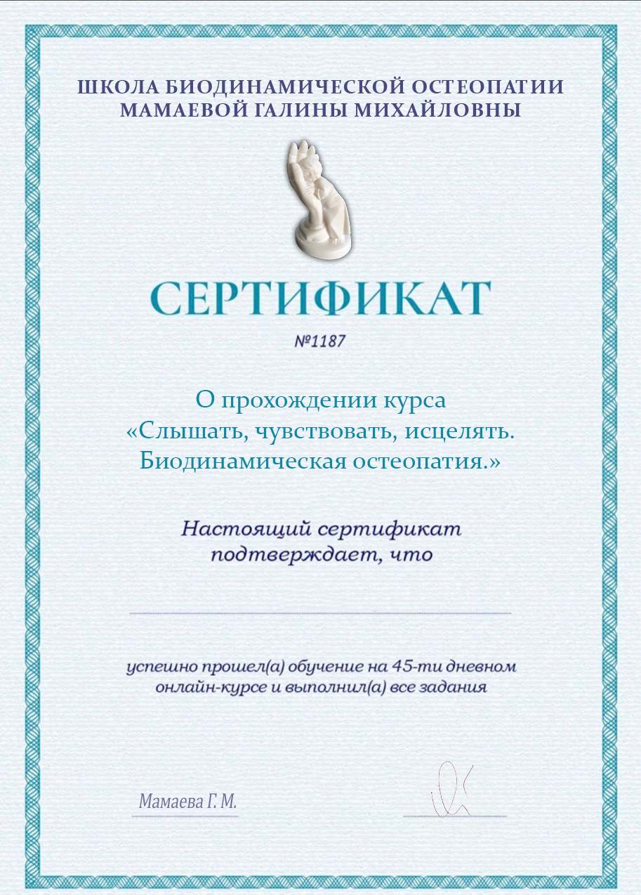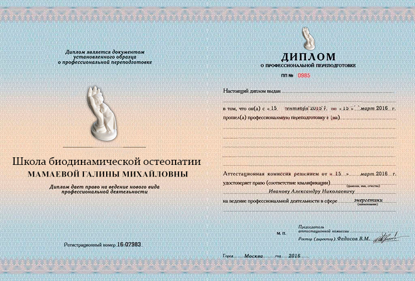 В конце, после прохождения курса и выполнения всех домашних заданий Вы получите именной сертификат Школы биодинамической остеопатии и диплом государственного образца.